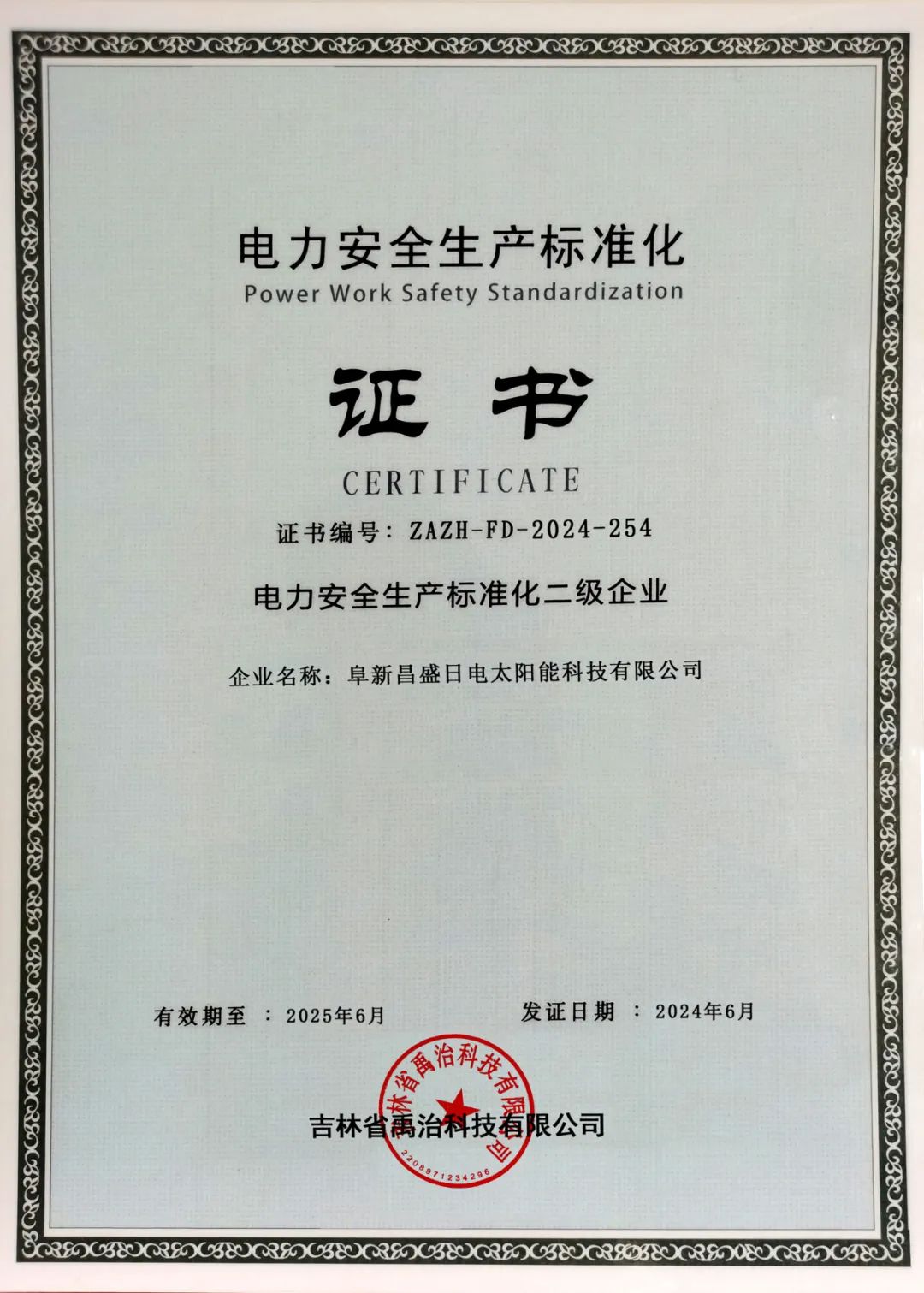 (图为下属项目公司电力安全生产标准化二级证书)
