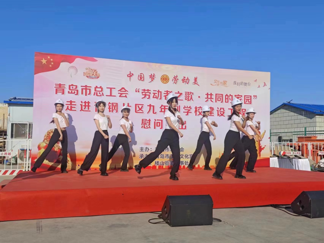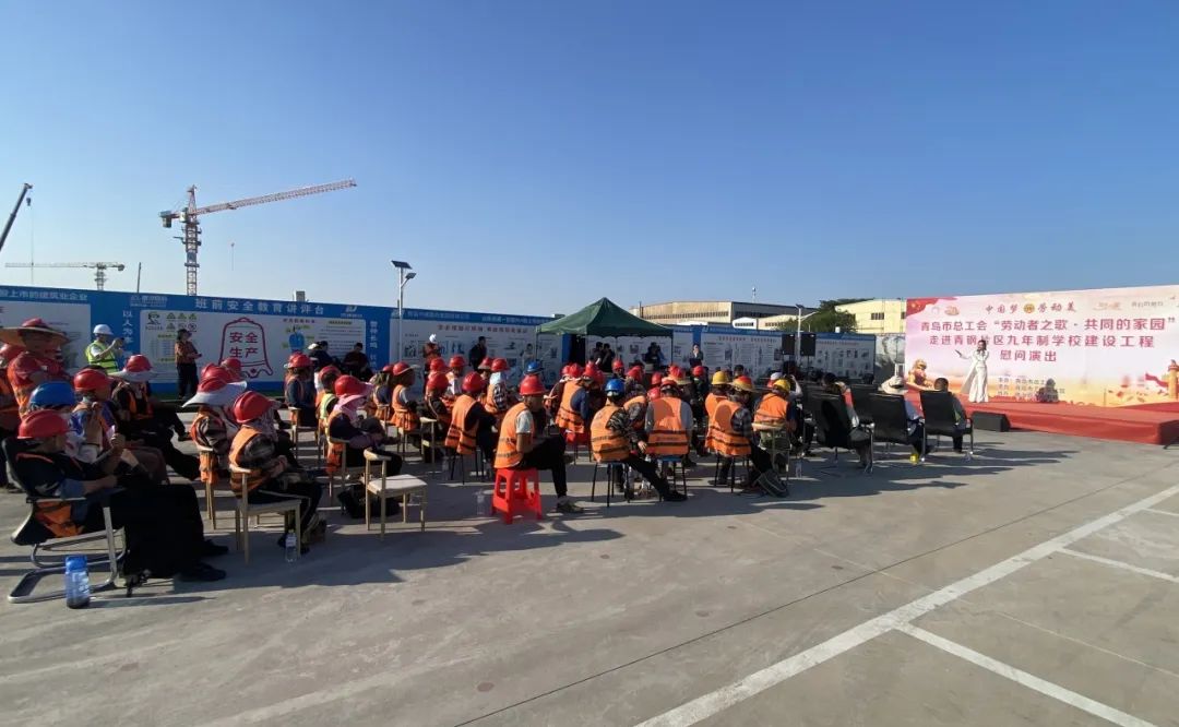 6月17日下午,由青岛市总工会主办、市工人文化宫及楼山街道办事处承办的“劳动者之歌·共同的家园”慰问演出在青岛城投集团青钢片区九年制学校工程项目现场举行,项目建筑工人、管理人员近百人观看了演出。