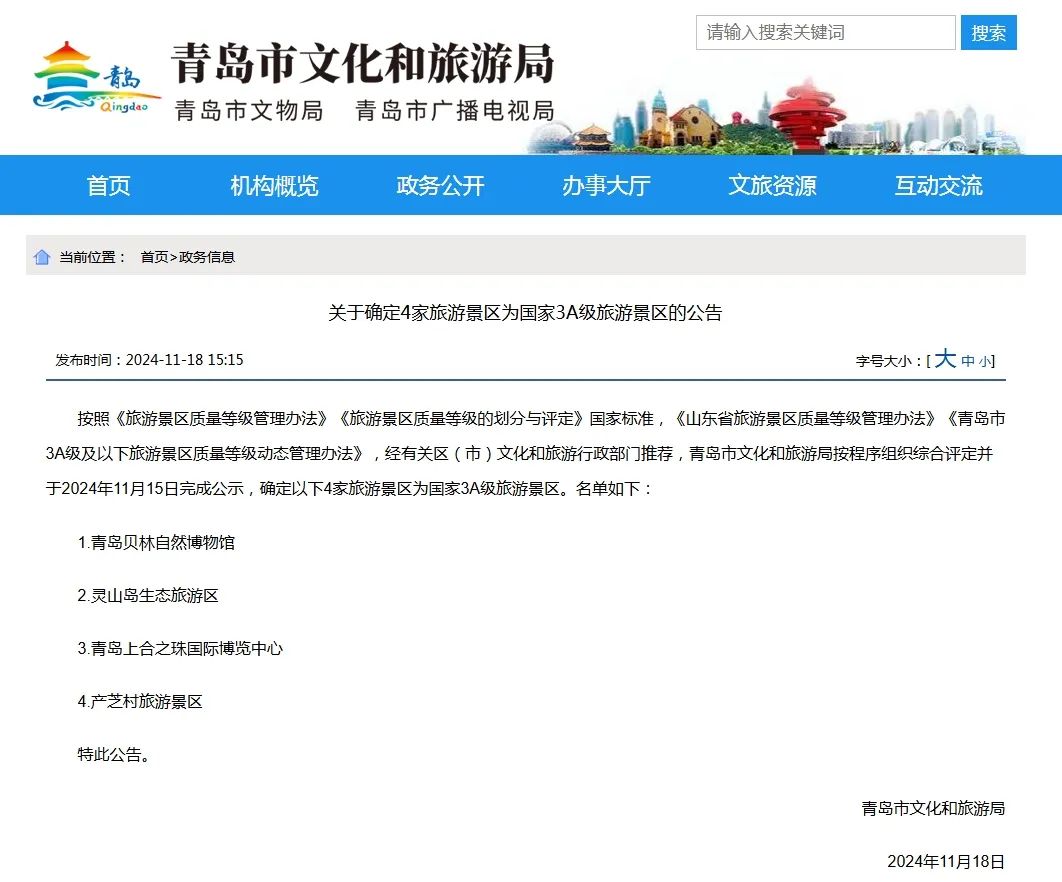 11月18日,青岛市文化和旅游局正式发布《关于确定4家旅游景区为国家3A级旅游景区的公告》,青岛城投集团投资建设的青岛·上合之珠国际博览中心成功获评为国家3A级旅游景区。