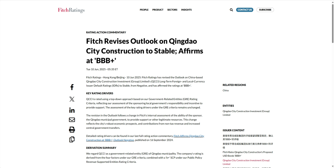 6月10日,惠誉国际评级正式宣布将青岛城投集团的的⻓期外币及本币发行人主体评级展望调整至稳定;确认“BBB+”的评级。