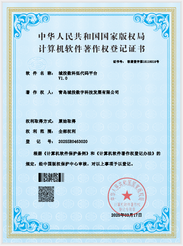 此次著作权突破,彰显青岛城投集团以科技驱动发展的战略定力。数科公司将持续加大研发投入,专注技术创新,致力于为客户提供更优质、更高效的软件产品与服务,不断提升市场竞争力,为集团数字化转型发展贡献坚实力量!