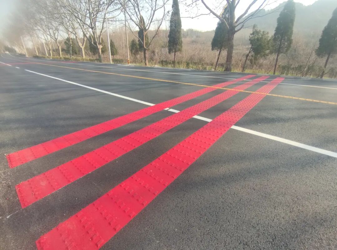 此外,交发集团在G341黄海线西海岸新区段大中修工程建设中创新引入无缝伸缩缝技术和红色减速带材料,是青岛市国省干线大中修项目的首次应用。无缝伸缩缝用高强度橡胶材质取代金属材质,有效解决了传统伸缩缝噪音大、易积水、行车颠簸等痛点,显著提升道路通行舒适度与耐久性。在杨家山里村段连续2公里长下坡路段,应用红色减速带以醒目色彩持续提醒驾驶员控速避险,为该危险路段行车安全筑牢预警防线。