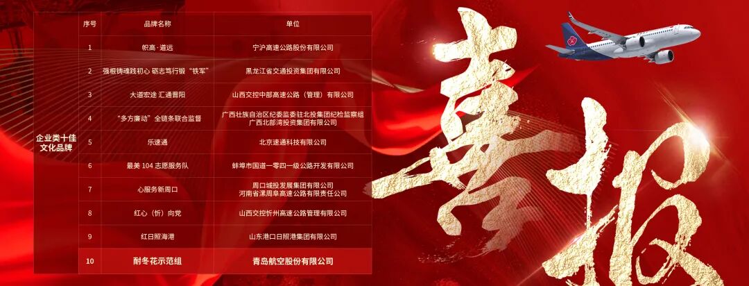 喜报!青岛航空荣获第七届交通运输优秀文化品牌“十佳”称号