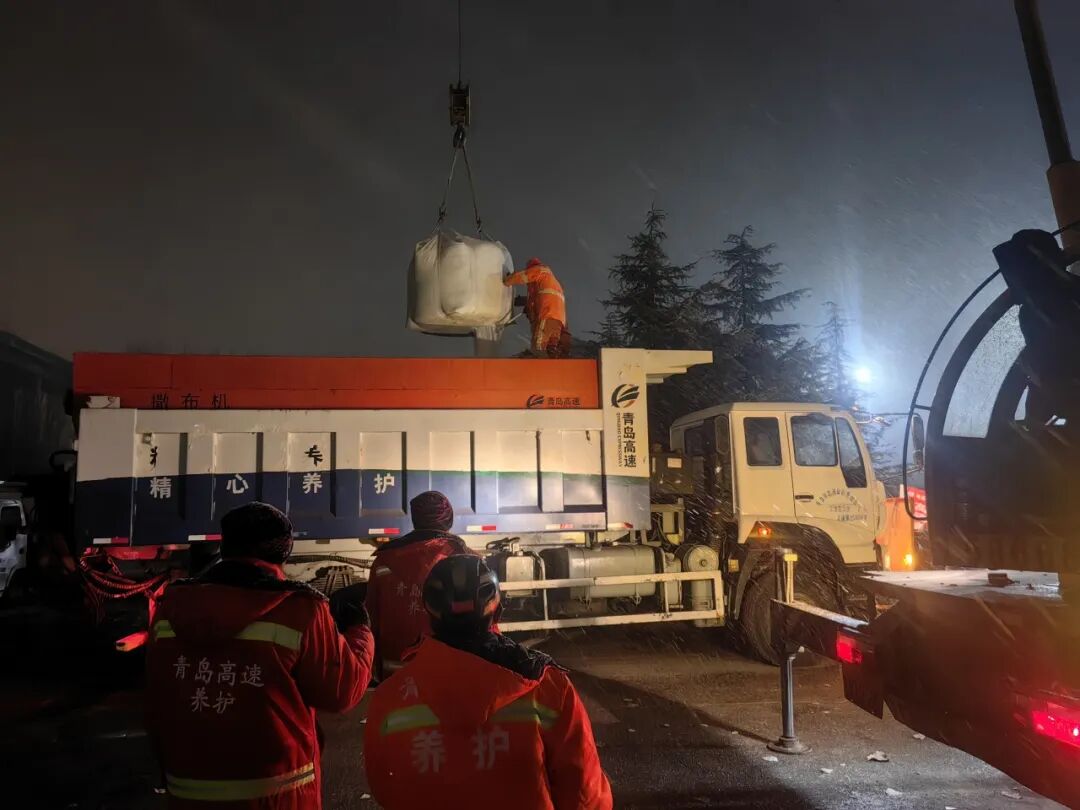 降雪来临前,青岛高速提前与气象、交警精准对接雪情预警信息,第一时间前置布设物资设备。累计完成19处清障救援驻点车辆储备与人员调配,在桥梁、急弯陡坡等重点路段预置融雪剂与防滑沙。严格落实24小时值班制度,强化养护、路产巡查与视频轮巡,实时掌握路面情况,提前消除安全隐患。