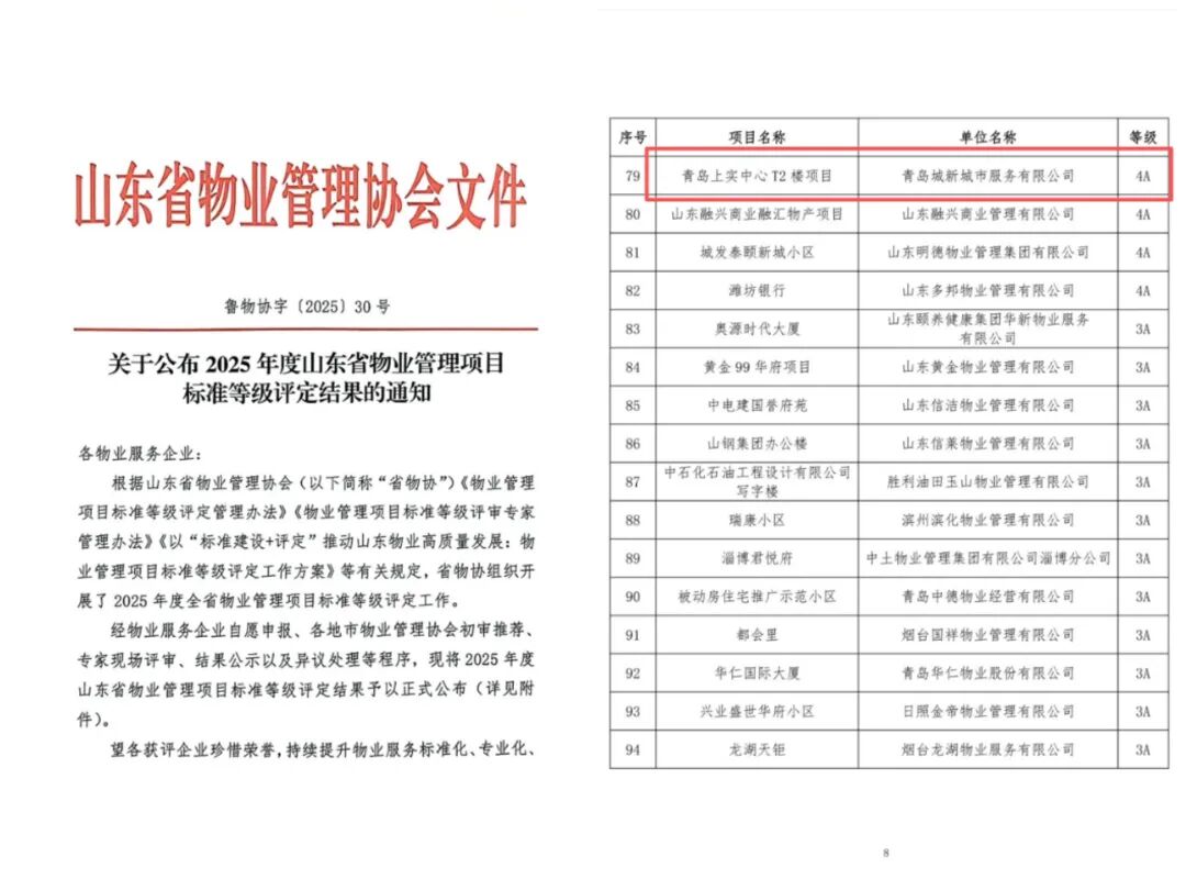 近日,山东省物业管理协会公布了2025年度物业管理项目标准等级评定结果,青岛城投商管集团下属单位青岛城新城市服务有限公司(以下简称“城新公司”),在全省众多参评企业中崭露头角,成功斩获山东省物业管理项目4A级认证。