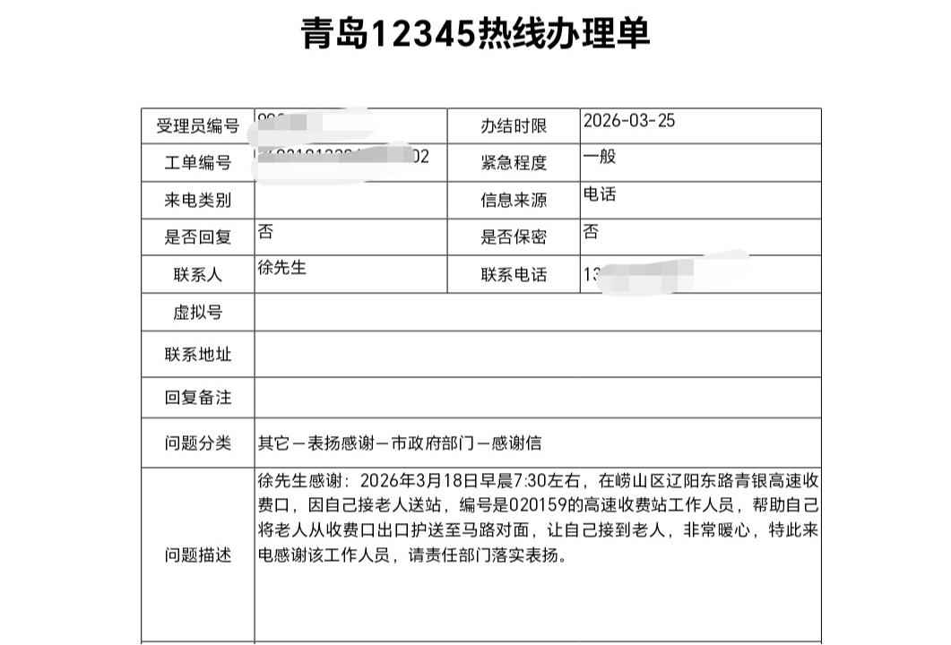 这份暖心的帮助让家属感念于心,后续专门致电12345热线,对青岛高速集团工作人员赵萌的热心相助表达由衷感激,希望能对其予以表扬。