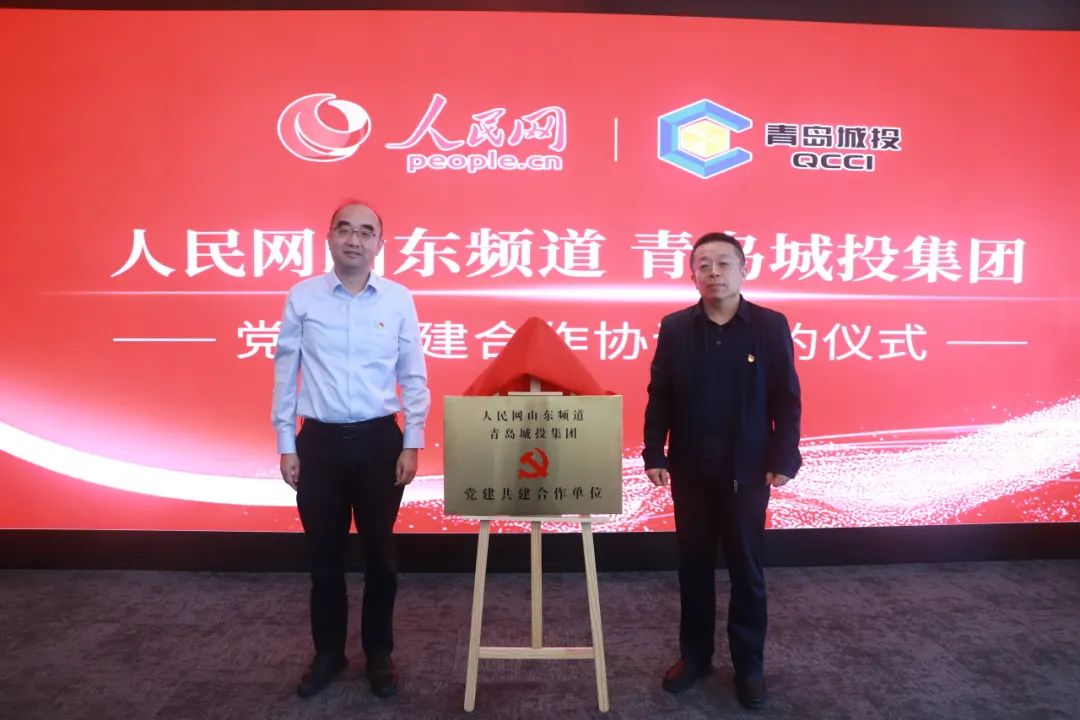 在签约环节,人民网股份有限公司山东分公司总经理邢强,青岛城投集团党委书记、董事长李蔚现场签署框架合作协议,并一同为党建共建基地揭牌。