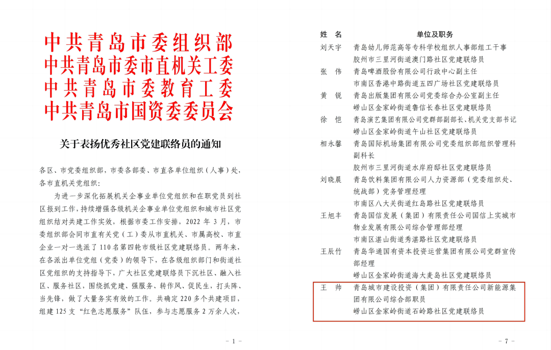 近日,市委组织部、市直机关工委、市委教育工委、市国资委四部门联合行文《关于表扬优秀社区党建联络员的通知》对青岛城投新能源集团王帅同志等55名优秀社区党建联络员进行了表彰。2022年以来,城投集团与金家岭街道石岭路社区开展党建结对共建“双报到”,本次表彰再次体现了有关部门对集团党建共建工作的高度评价。