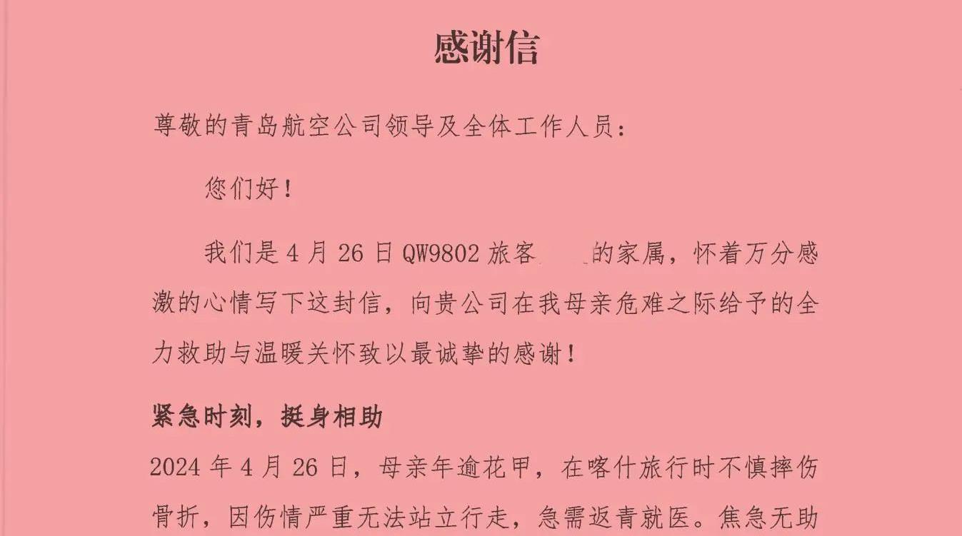 近日,一封含“赞”量满满的感谢信被专程送到了青岛城投集团旗下青岛航空的值机柜台。信中,旅客家属用“雪中送炭的人间大爱”形容这段跨越千里的护航之旅,字里行间流淌的真情,让这封不足千字的信件成为青岛航空真情服务的最佳见证。(图为乘客发来感谢信)4月26日,年逾花甲的旅客万女士在喀什旅行时不慎摔伤骨折,因伤情严重无法站立行走,需搭乘青岛航空QW9802航班返青就医,家属在焦急无助之际联系青岛航空求助。接到旅客求