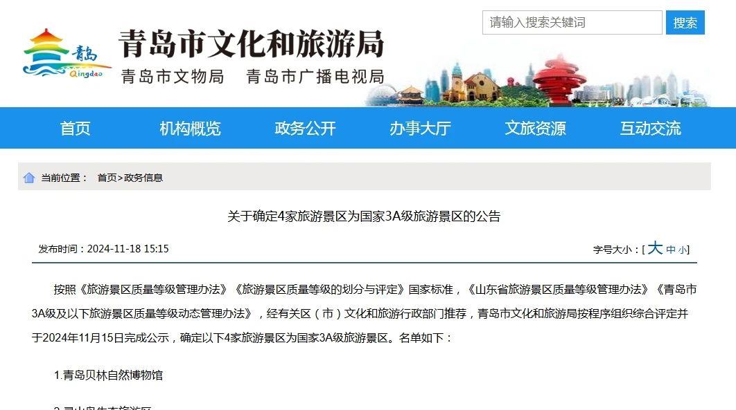 11月18日,青岛市文化和旅游局正式发布《关于确定4家旅游景区为国家3A级旅游景区的公告》,青岛城投集团投资建设的青岛·上合之珠国际博览中心成功获评为国家3A级旅游景区。(图为青岛市文旅局网站截图)青岛·上合之珠国际博览中心项目是城投集团匹配省市两级重大部署和城市发展战略,是山东省和青岛市在更大范围、更宽领域、更深层次推动上合组织及“一带一路”沿线国家间双多边资本、技术、人才深度交融的重要平台,是集“展、