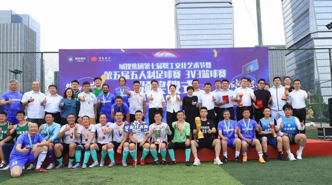 6月19日,经过为期14天的激烈角逐,青岛城投集团第七届文化艺术节暨第五届五人制足球赛在一片欢乐而热烈的氛围中顺利落下帷幕。城投集团党委委员、工会主席郭健出席活动,集团工会及各参赛单位工会有关负责同志参加颁奖仪式。(图为颁奖仪式活动现场合影)本次足球赛由城投集团工会主办,青岛航空工会承办,分小组赛、半决赛、总决赛进行。在为期半个月的赛程中,来自集团各板块共8支队伍齐聚绿茵场地,共享足球运动的欢乐,并收