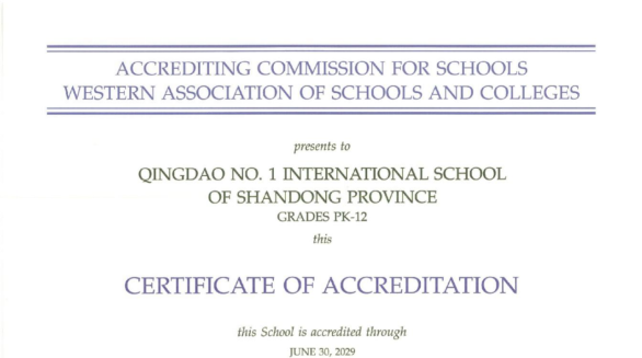 近日,青岛城投集团旗下的青岛第一国际学校荣获美国西部学院和学校协会(WASC)资质认证证书,认证期为6年。在大中华地区一千余所国际学校及国际化学校中,通过WASC认证或被列为候选的学校仅有59所,其中山东省内仅有2所;同时作为SAT(美国高考)校内自考点并可承接外部符合条件的各国籍学生参加考试,在整个北方地区仅1所,因此成为全省唯一一所具备SAT+WASC双认证“金字招牌”的国际学校。(图为WASC认证证书)第一国际学校已累