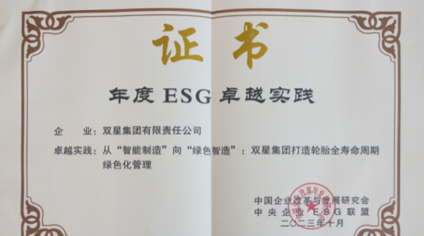 10月22日,“ESG中国论坛创新年会”在北京召开,中国ESG企业社会责任发布活动同时举办,并发布了《年度ESG卓越实践报告》,集中展示了在ESG领域表现突出的30个卓越案例。双星集团凭借践行ESG治理、创造ESG价值、建设ESG生态,以《从“智能制造”向“绿色制造”:双星集团打造轮胎全寿命周期绿色化管理》案例与中石化、国家电网、中国移动等企业共同入选,成为轮胎行业唯一入选企业。(图为获奖证书)ESG是指环境、社会、公司治理